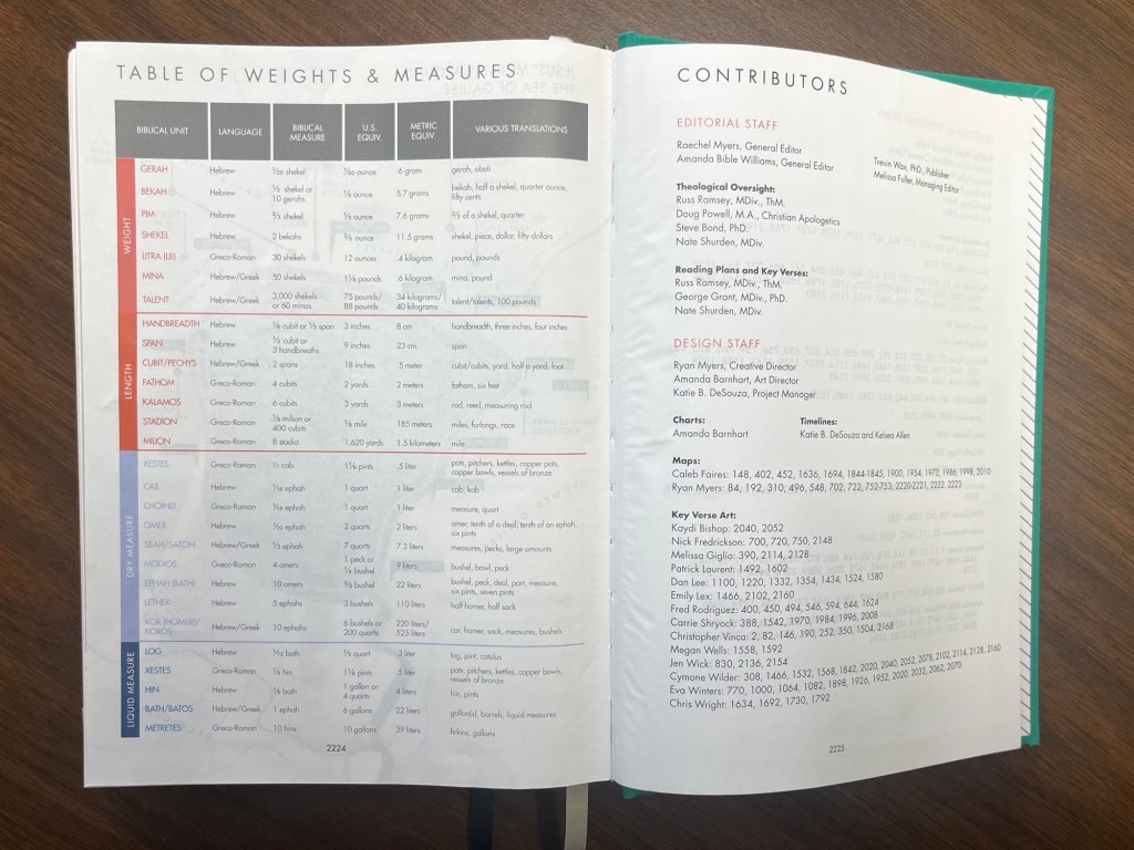 Lastly, we have a table of weights and measures. This is a thing that I didn’t know I needed, but since I know it’s there, I’ve looked at it several times. Again, it just helps to give context and clarity to what you’re reading.