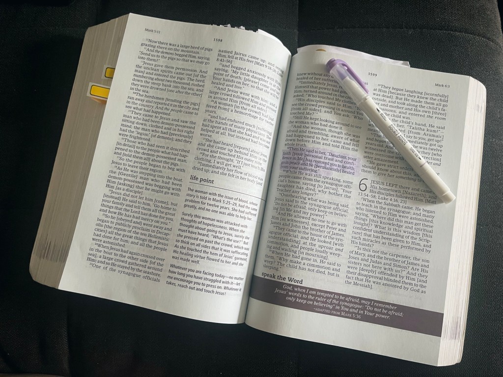 Then He said to her, “Daughter, your faith has restored you to health. Go in peace and be healed from your suffering.” -Mark 5:34
